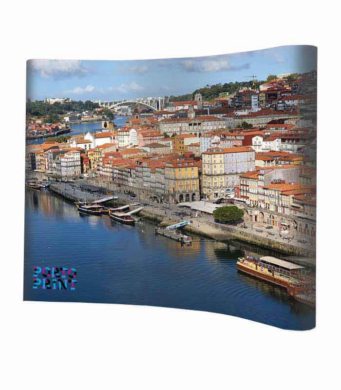 O Pop Up ECO Curvo possui uma moldura curva de alumínio escovado robusta e leve. A fixação das imagens personalizadas à moldura através de tiras adesivas magnéticas. De fácil montagem inclui ainda um saco de transporte em nylon com rodas para o seu transporte. Altura: 230cm Largura: 210cm